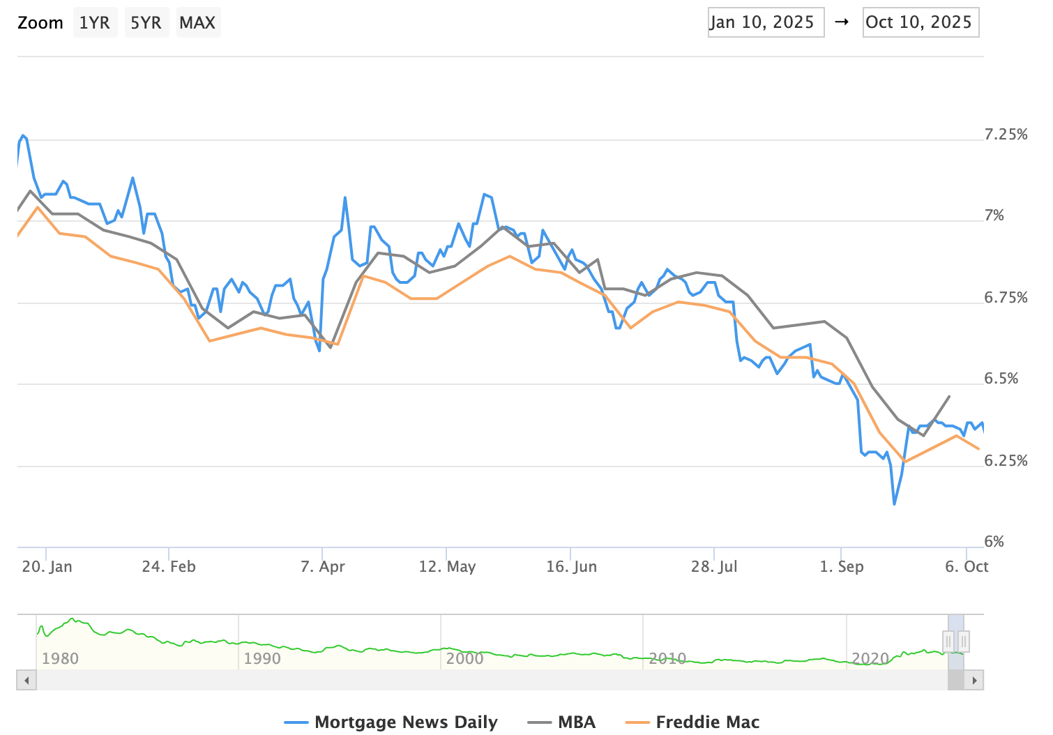 As of early October, 30-year mortgage rates are holding steady at around 6.3%, roughly the same as in early September but well below the 7% levels seen earlier this year. The Federal Reserve made its first rate cut of 2025, lowering its benchmark rate by 0.25%. While the impact on mortgage rates has been limited so far, most experts agree that more rate cuts could be coming before the end of the year.